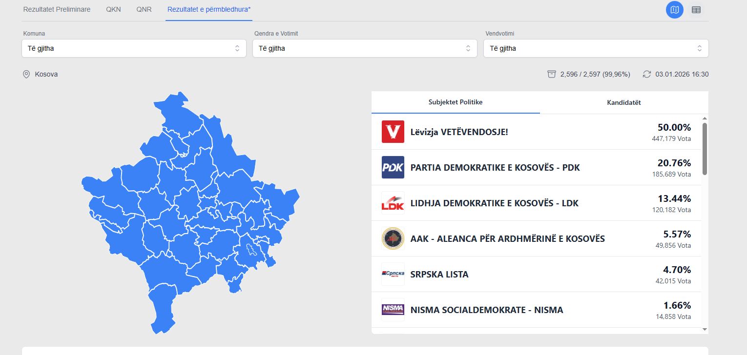 Pas përfundimit të numërimit të votave të diasporës, Lëvizja Vetëvendosje ka arritur mbi 50 për qind të votave, gjithsej 447.179.